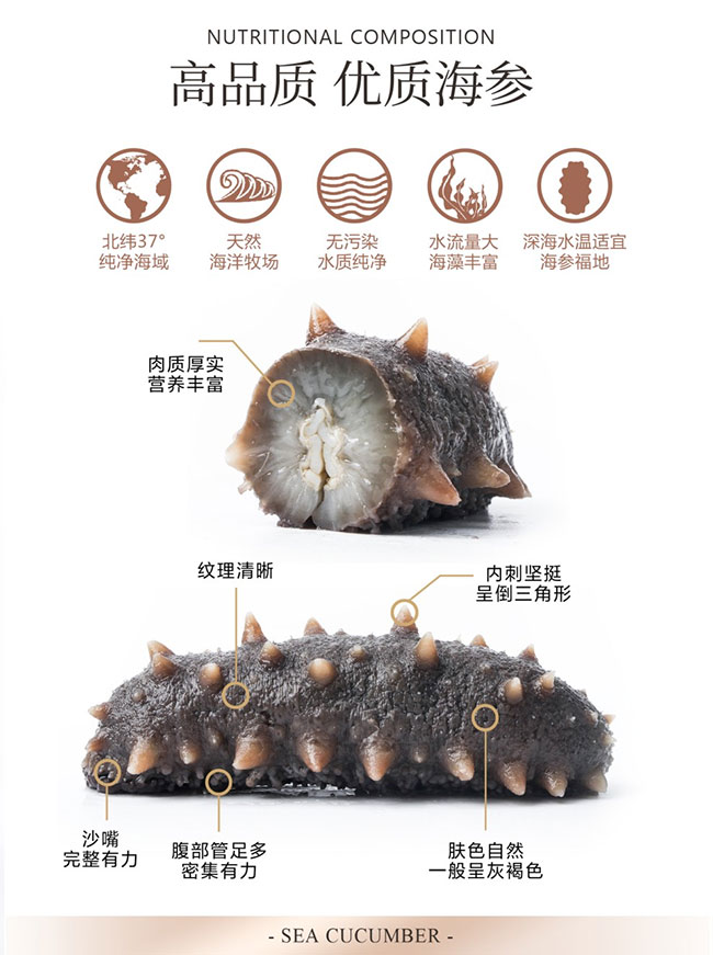 海參屬于無脊椎動物、棘皮動物門、海參綱。我國海參分布在溫帶區(qū)和熱帶區(qū),溫帶區(qū)主要在黃渤海域,主要經(jīng)濟品種是刺參,也是我國最為知名的海參種類,熱帶區(qū)主要在兩廣和海南沿海,主要經(jīng)濟品種有梅花參等。其中西沙群島、南沙群島和海南島是我國熱帶海參的主要產(chǎn)地。海參在各類山珍海味中位尊“八珍”,還具多種中醫(yī)特指的補益養(yǎng)生功能。近半個世紀以來,國內(nèi)外學者對40多種海參化學成分的研究表明海參體內(nèi)不但富含氨基酸、維生素和化學元素等人體所需的50多種營養(yǎng)成分,還含有多種生物活性物質(zhì)如酸性粘多糖、皂苷和膠原蛋白等,而且海參活性物質(zhì)的藥理活性十分廣泛。